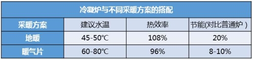 地暖是45-50℃低温出水,冷凝壁挂炉在低温工况下能实现更高的热效率。通常情况下,冷凝壁挂炉在30-50℃低温工况下,能实现高达108%的热效率;而在60-80℃高温工况下,只能实现96%的热效率。而一般的普通炉都是高温60-80℃打开方式,热效率只有90%。热效率越高,节能效果则越好。